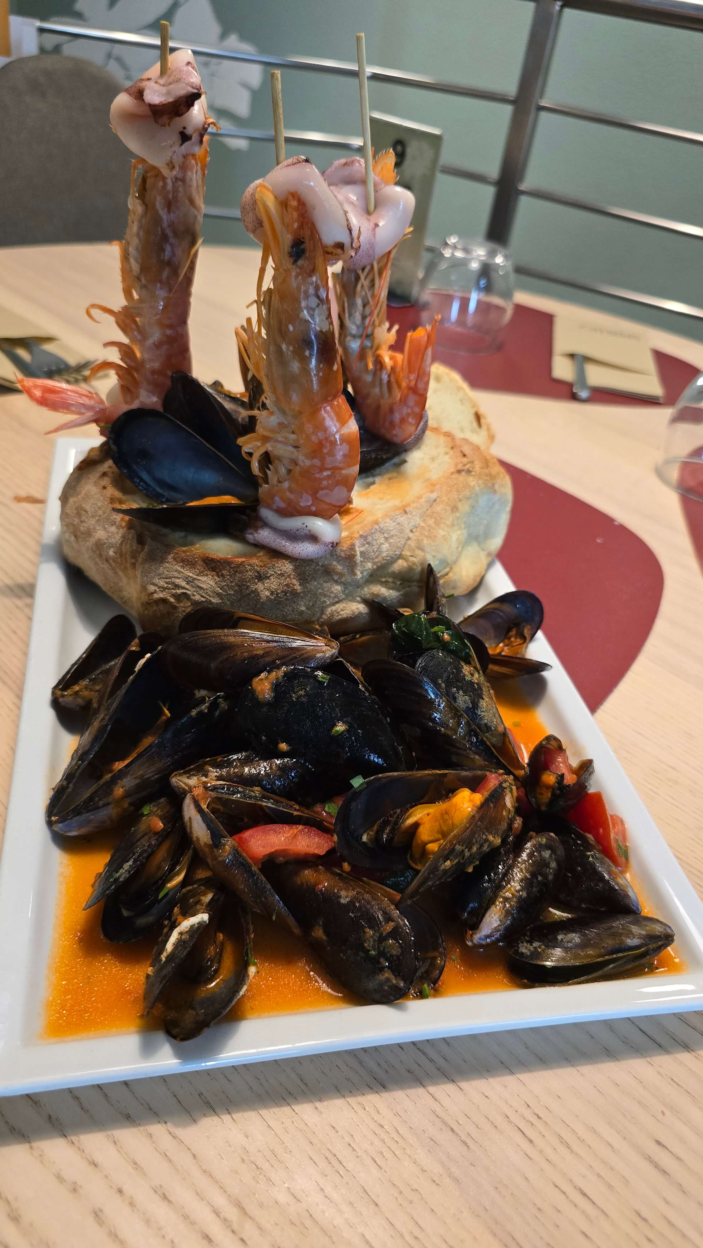 Im Inneren gibt es eine reichhaltige Muschelsuppe, die mit reifen Tomaten, Knoblauch, Petersilie und frischem Basilikum gekocht wird, für einen intensiven und einhüllenden Geschmack, der beim ersten Geschmack erobert.