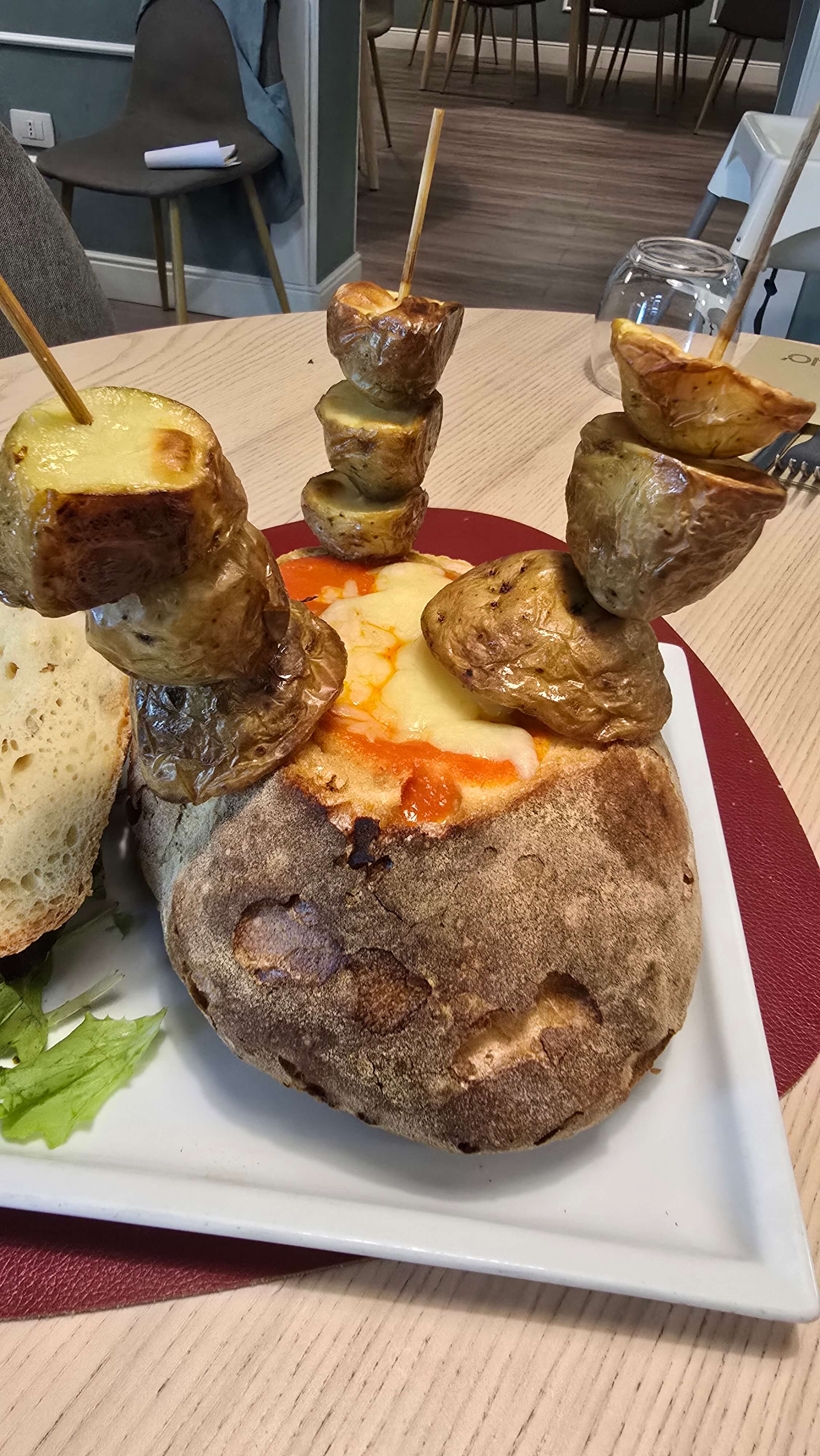 Lassen Sie sich von den Düften und Aromen Sardiniens mit unserem außergewöhnlichen "Sardo" verwöhnen. Dieses einzigartige Gericht beginnt mit einem runden Brotlaib, außen knusprig und innen weich, sorgfältig ausgegraben, um ein cremiges Pecorino-Fondue aufzunehmen. Das Fondue, reich und umhüllend, wird mit dem besten sardischen Pecorino zubereitet, der einen intensiven und authentischen Geschmack verleiht.