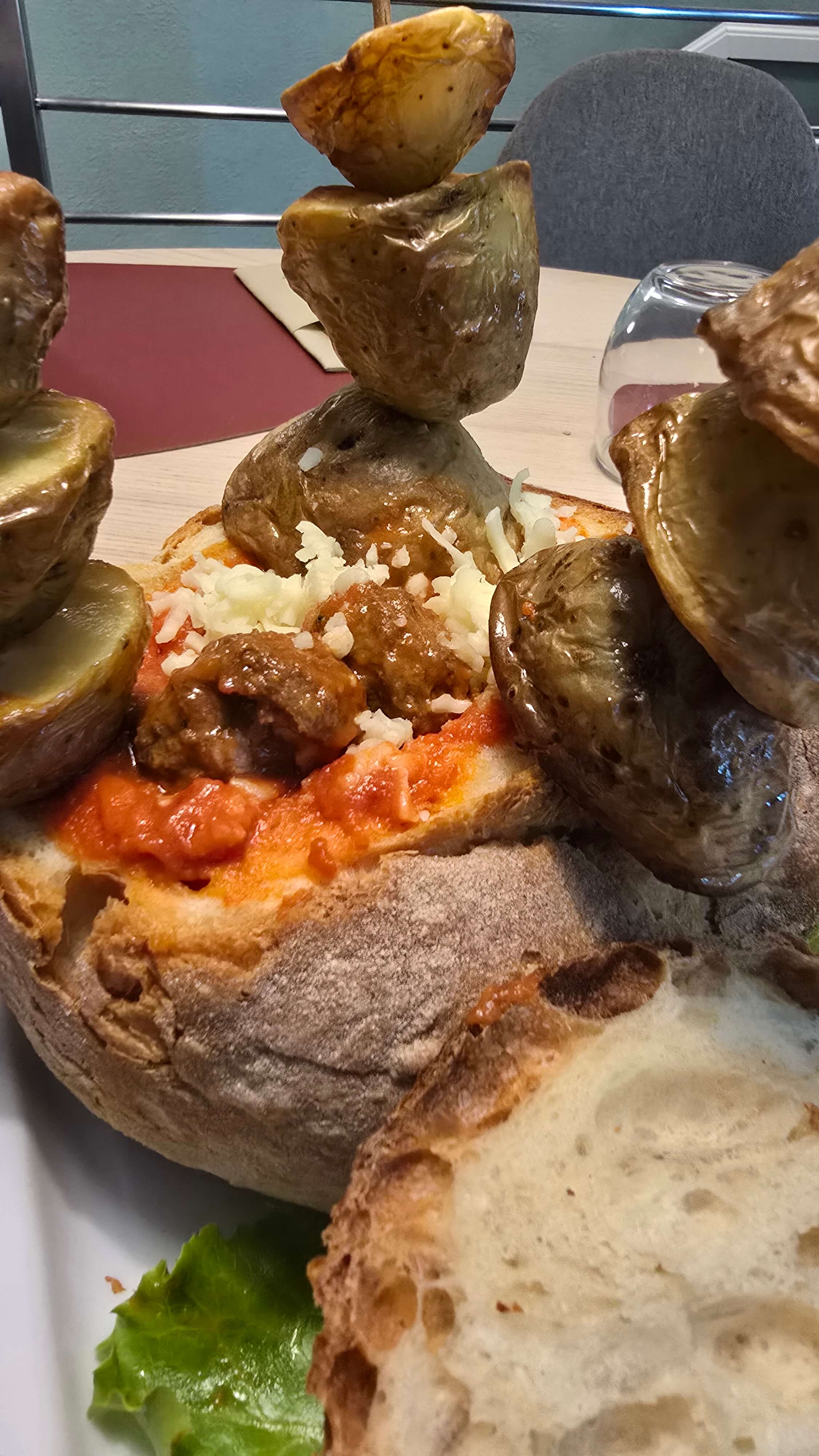 Ein einzigartiges, schmackhaftes Gericht, das Tradition und Innovation vereint. Ein sardisches Brotstück, das "tondo sardo" genannt wird, wird aus der Krume entleert und mit Rindfleischklößchen in Sauce gefüllt, die sorgfältig zubereitet werden, um den Geschmack des Fleisches zu verstärken. Abgerundet wird das Gericht durch gebackene Gemüsespieße aus Auberginen, Zucchetti und Peperoni mit einem Hauch von Frische und Farbe. Dieses Gericht ist eine Hommage an die sardische Küche mit einem modernen Twist, der sicherlich die raffiniertesten Gaumen begeistern wird.