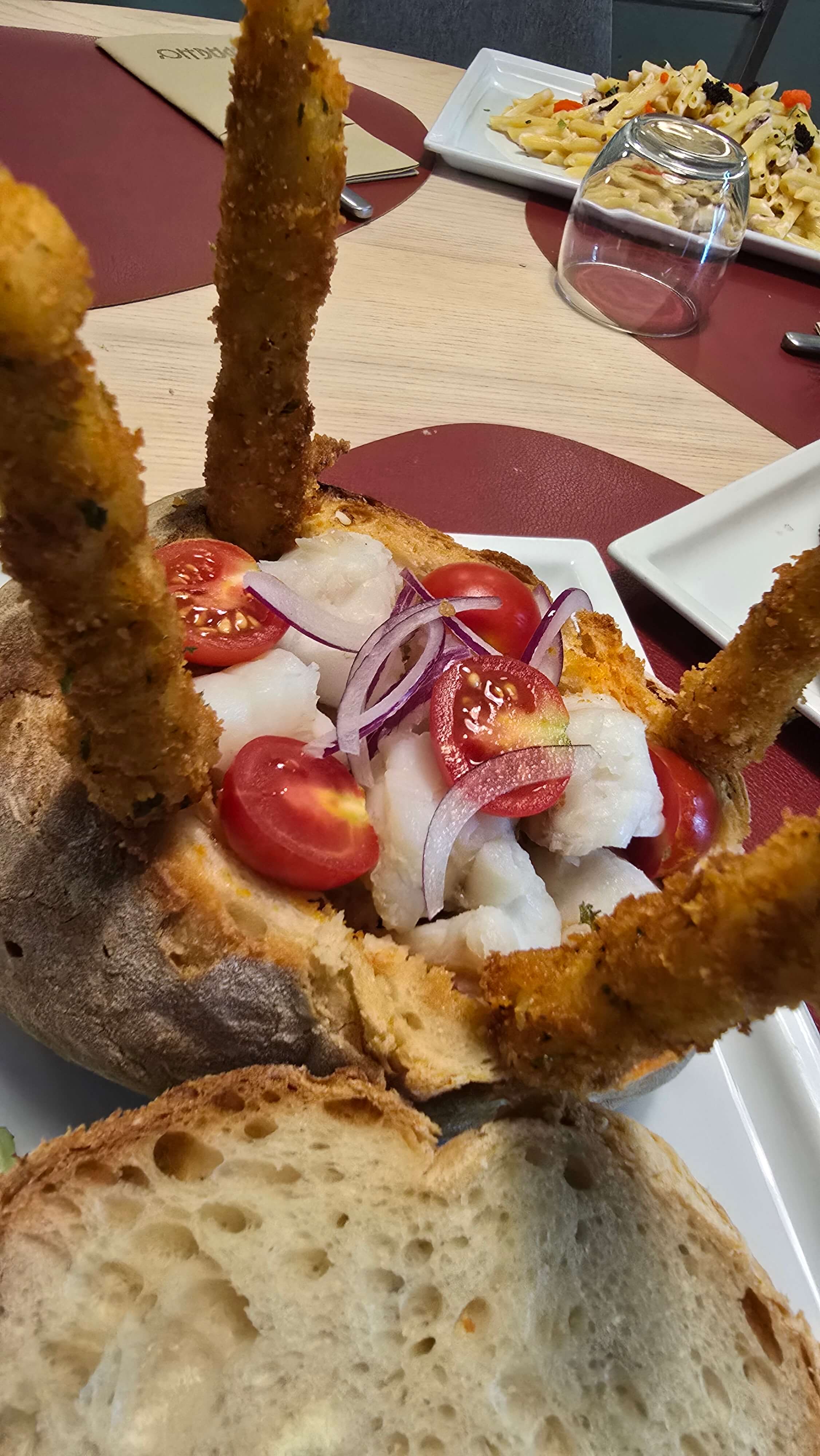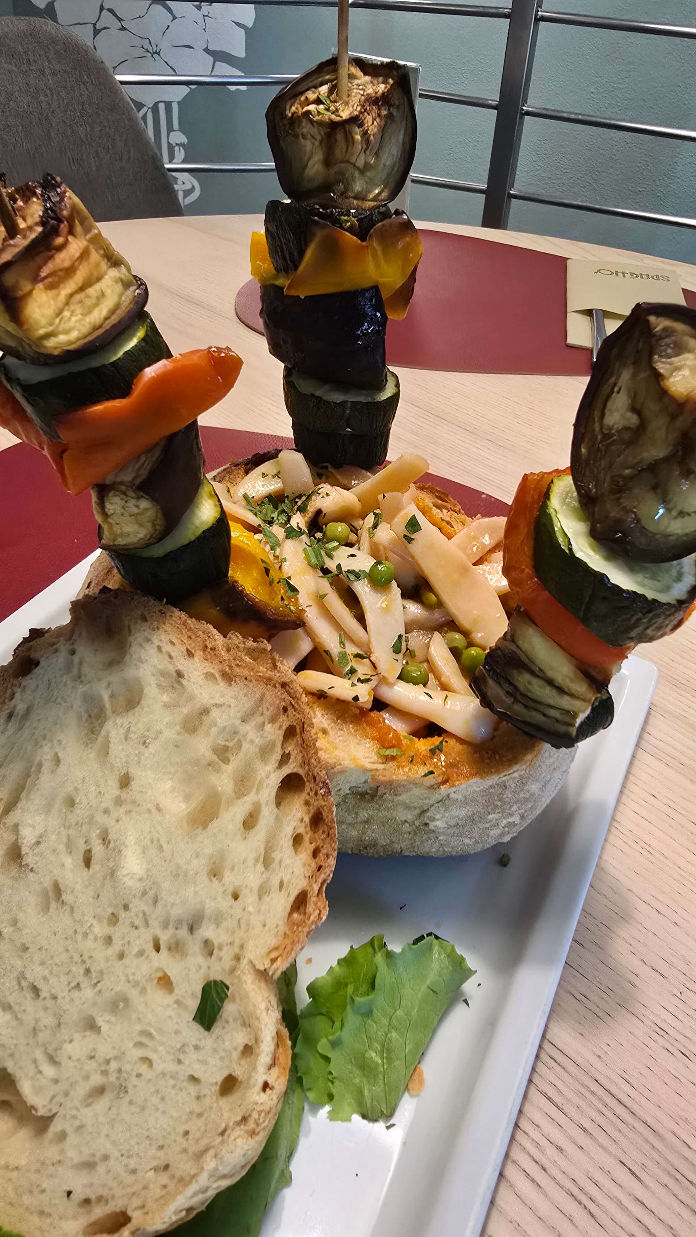 Ein duftendes Brot Tondo di Sorso, gefüllt mit frischem Gattuccio, gewürzt mit authentischer Agliata algherese: eine cremige Sauce aus Tomaten-Knoblauch, extra nativem Olivenöl, Petersilie und einem Hauch von Essig, der den Geschmack des Fisches zart unterstreicht. Abgerundet wird das Gericht durch saisonale Gemüse-Spiesschen, die mit Sorgfalt gegrillt werden und einen perfekten Kontrast zwischen Geschmack und Konsistenz bieten. Eine Hommage an die maritime Tradition von Alghero, neu interpretiert mit Einfachheit und Geschmack.