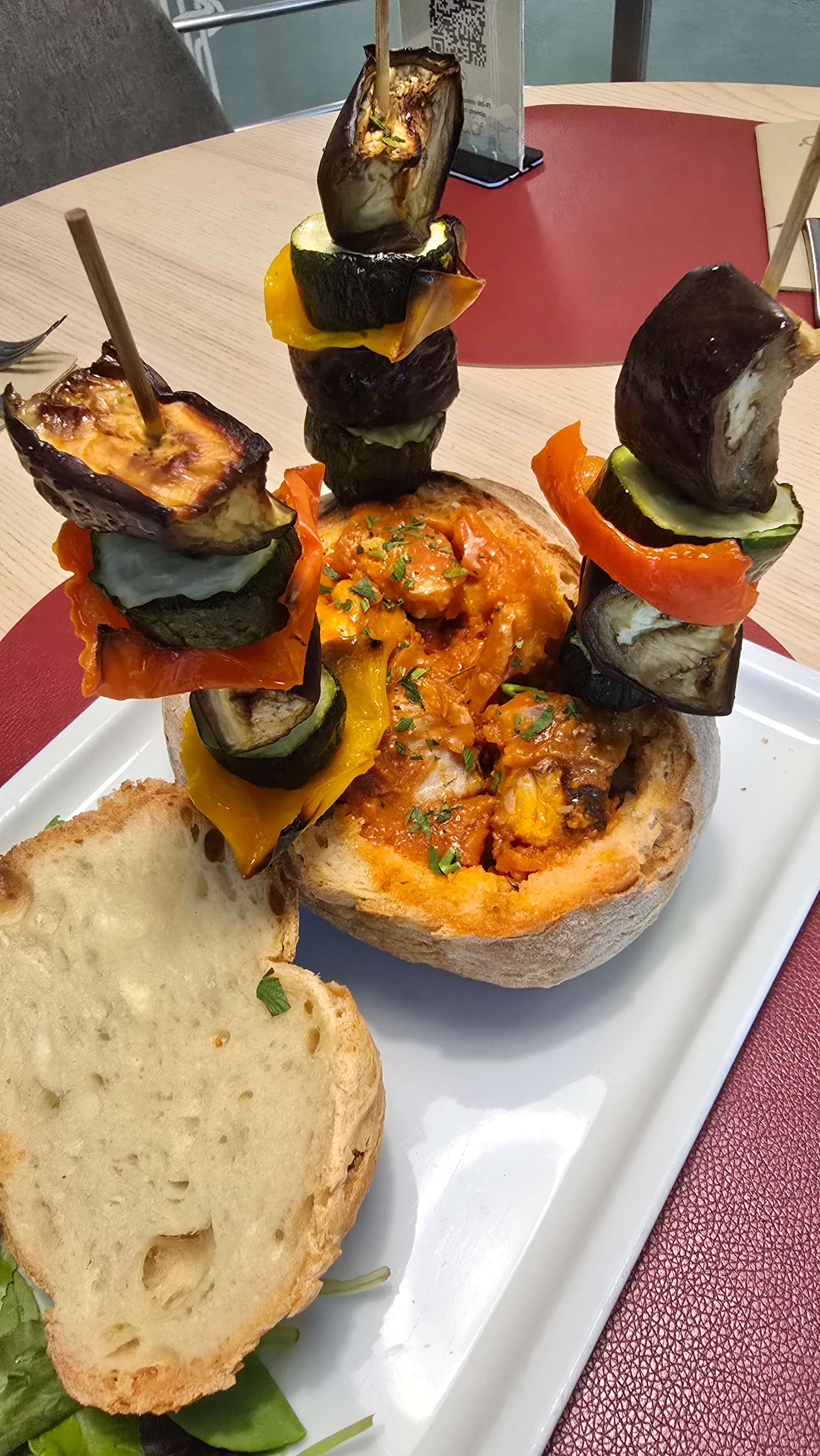 Um dieses kulinarische Erlebnis zu vervollständigen, werden an den Rändern des Brotes Spieße mit Garnelen und Tintenfisch, mariniert mit Kräutern und auf dem Grill gekocht, für eine Meeresnote, die die Frische der Zutaten verstärkt.