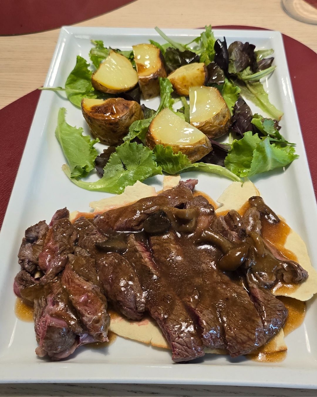 The dish is completed with baked potatoes, golden and crispy on the outside, soft and buttery on the inside, seasoned with fresh rosemary and a pinch of salt, which add an additional layer of delicacy.