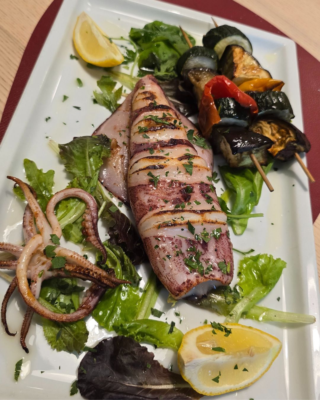 Accompanied by a feast of grilled vegetables, each dish becomes a culinary masterpiece: crispy zucchini, sweet peppers and tasty aubergines, all enhanced by a drizzle of oil and a sprinkling of fresh oregano. These vegetables, cooked over a high heat, retain their freshness and vibrant color, offering a perfect contrast with the softness of squid.
