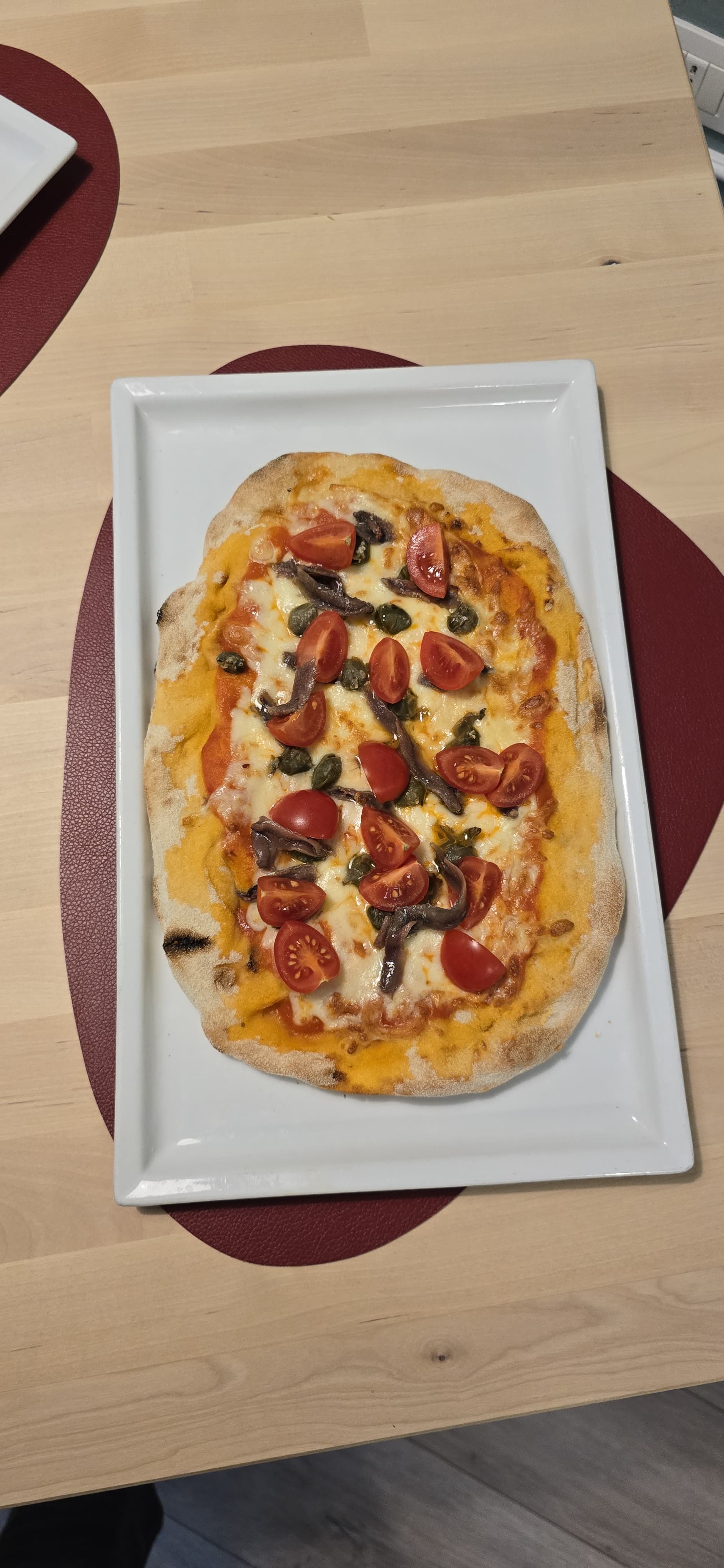 Imagine a light, crisp pinsa base, like a cloud that melts in your mouth. On this white canvas, an explosion of marine flavors: anchovies with an intense taste, salty at the right point, marry perfectly with the crisp and slightly acidic capers.