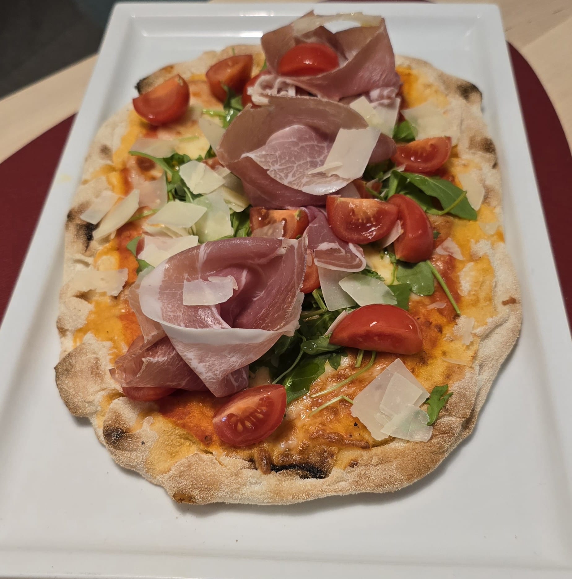 At the first bite, an explosion of flavors conquers the palate. The salty taste of the ham blends perfectly with the freshness of the rucola and the sweetness of the cherry tomatoes. The crunchy Grana Padano contrasts with the softness of mozzarella, creating a unique and enveloping texture. The fruity extra virgin olive oil enhances all flavors, giving an unforgettable taste experience.
